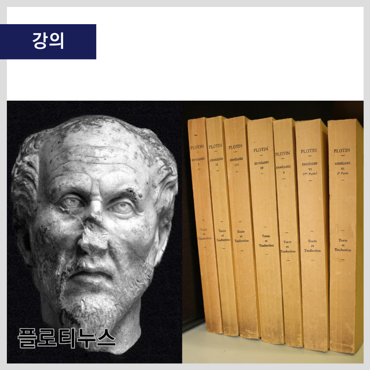 | 2주차 | 12월 22일(월) 2교시 (16:40-18:30) 플로티누스 (205-270) 1 플로티누스는 “신플라톤주의”라 불리는 사상 흐름의 창시자다. 플로티누스는 플라톤이 명시적으로 말하지 않은 것들을 가지고 독창적인 세계관을 구상했다. 영혼을 돌보는 것으로서의 플라톤 철학이 플로티누스의 세계 이해에 구체적으로 어떻게 상응하는지를 알아본다. |