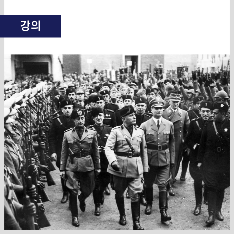 | 3주차 | 1월 2일(금) 3교시 (19:30-21:20) 파시즘 독재체제의 확립(1922~29) 마테오티 암살사건(1925)으로 촉발된 위기가 파시즘 독재체제 수립으로 이어진 과정을 알아보고 독재권력의 위상 강화를 위한 수단들(선전선동과 지도자 숭배)에 대해 논한다. |